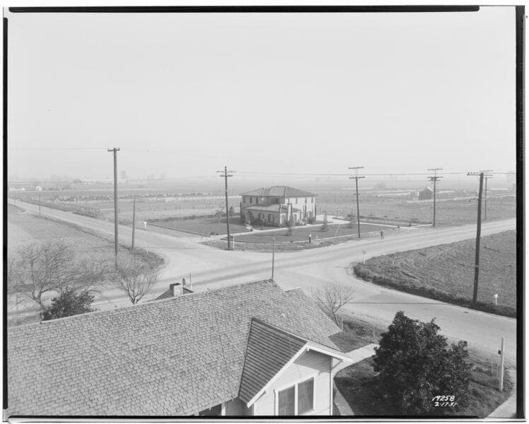 A1.2 - Accidents - Northeast overview of intersection on Imperial Highway, 2 miles south of Downey and several miles north of Bellflower. [earlier accident in 1929 recorded this same intersection as Cerritos Blvd. and Zinn Rd.] [EMSCO Aircraft hanger visible in distance].