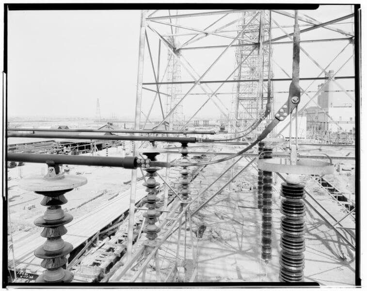 Long Beach Steam Station, Plant #3 - Detail of insulators and cable connections on Take-off Tower