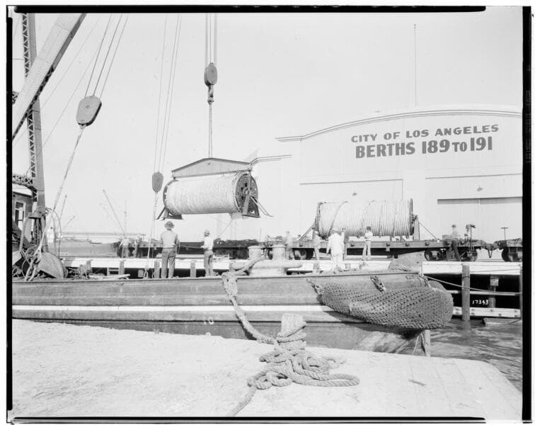 Distribution, Underground - Submarine Cable - Lowering reel onto barge with special beam.