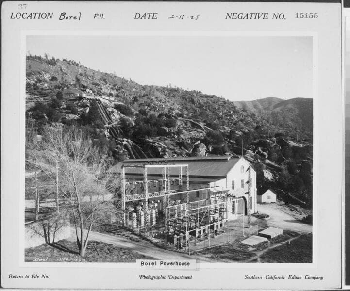Borel - General view of Powerhouse, penstocks, forebay, and associated cottages in 1911. [Sign on front of the plant says "Kern River Company".]
