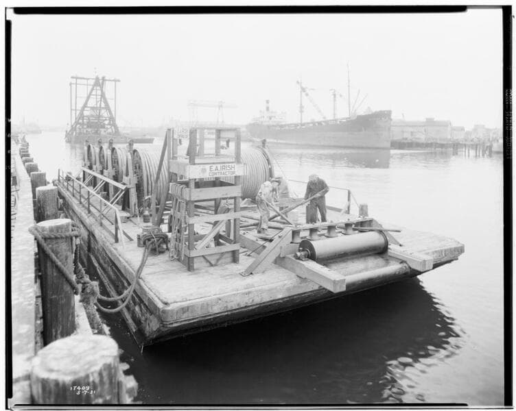 Distribution, Underground - Barge with 4 reels of submarine cable ready to lay across Long Beach channel.