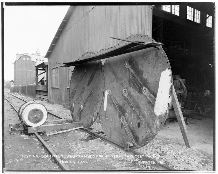 T2 Testing - Testing Equipment for Destruction Test No. 6 - Wolf. A.O. Smith Pipe failed at 1100 lbs/sq. inch.