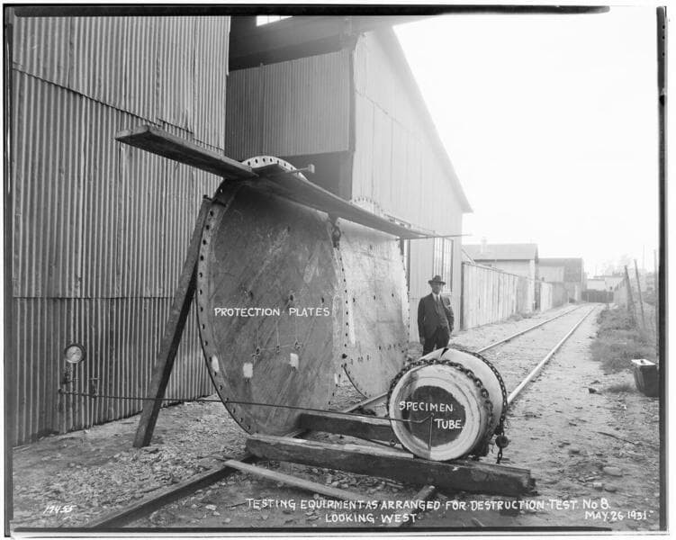 T2 Testing - Testing Equipment for Destruction Test No. 6 - Wolf. A.O. Smith Pipe failed at 1100 lbs/sq. inch.