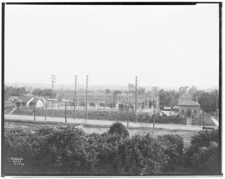Redlands Substation - Redlands - Steam plant property. The two fuel oil tanks, the cooling tower, and condenser reservoir were located just north of the powerhouse.