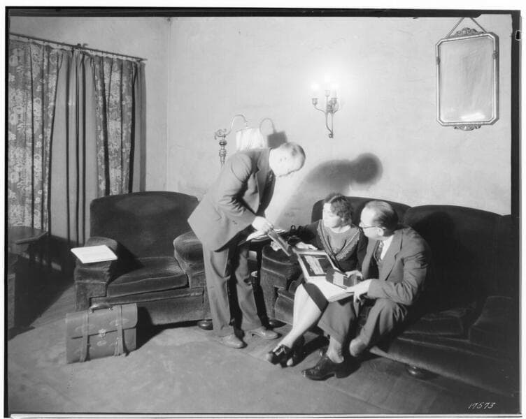 A3.1 - Appliances miscellaneous - Stills taken at Frigidaire Sales Rooms [husband & wife being photographed in living room.].