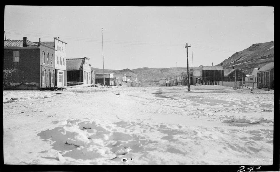 Area view of Main Street at 17th Street looking North, showing distribution lines, people, and railroad tracks and autos.