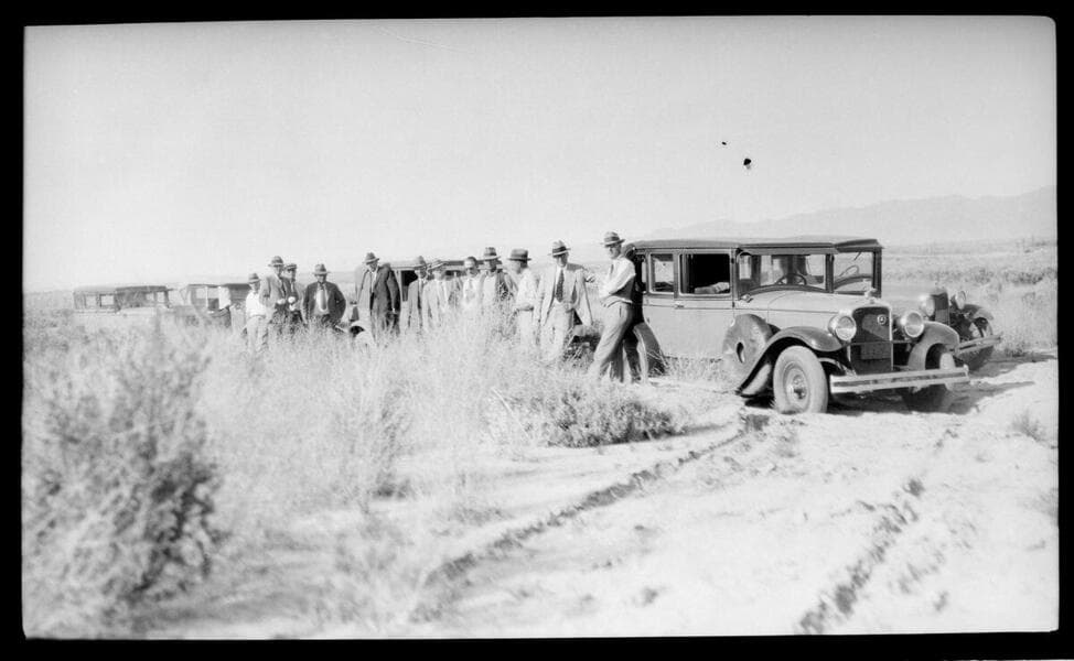 Several cars and men in the desert