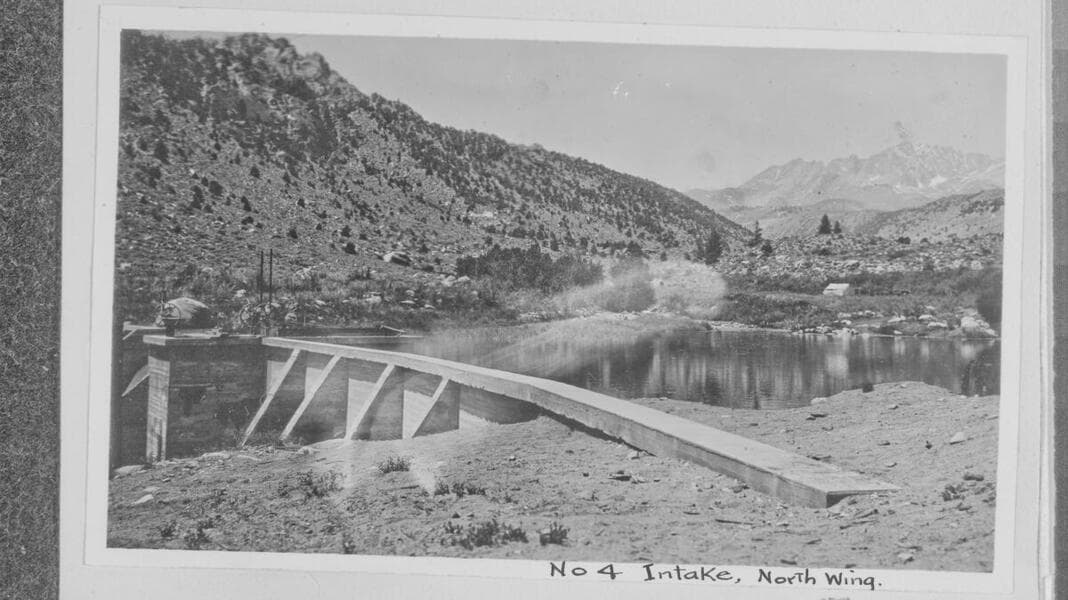Intake 2 Reservoir on North Fork Bishop Creek, Dam site - Reservoir No. 2, Lake on Middle Fork of Bishop Creek (Reservoir No. 1), dam site Reservoir No. 1, dam and intake, wood stave flowline, construction of a Bishop Creek Powerhouse [looks like Plant No. 4].