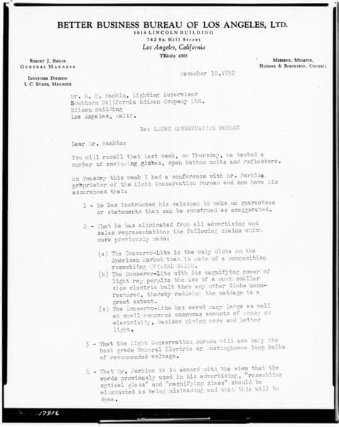 C1.2 - Letters - Letter to Edison from the Better Busiiness Bureau concerning truth in advertizing for "Conservo-lite" light bulbs produced by Light Conservation Bureau. page 2.