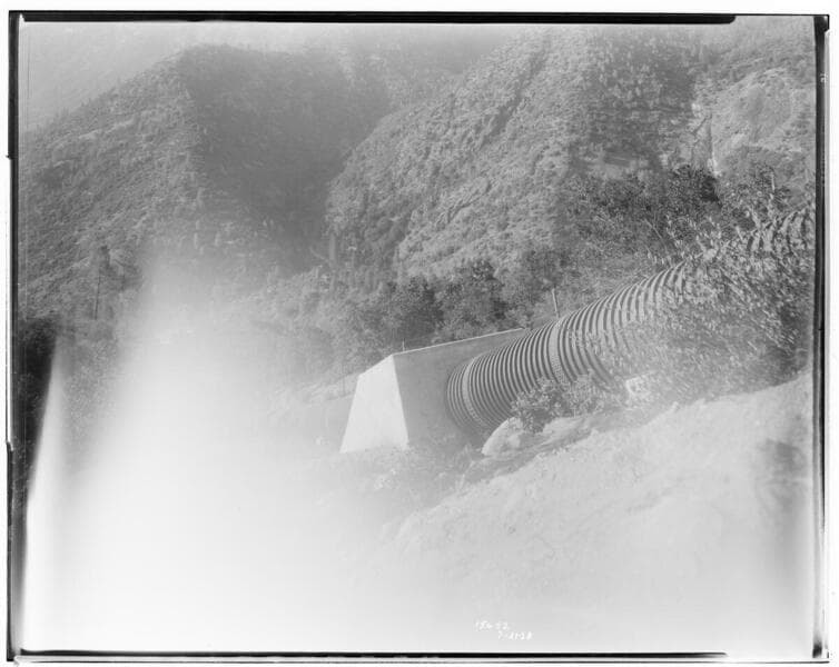 Powerhouse 2a - Looking downhill along penstock for Powerhouse 2A from the point above the S.J.E. & R.R. at West Portal. The pipe showing in the picture is the Ferrum banded. The concrete culvert enclosing the penstock is shown in the picture where the pipe passes through the culvert and under the SJ&E Railroad. .