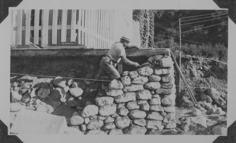 San Gorgonio Hydroelectric - After storm - Cottage at San Gorgoio Plant #2 almost undermined by March flood waters. Residence of P. F. Helton.