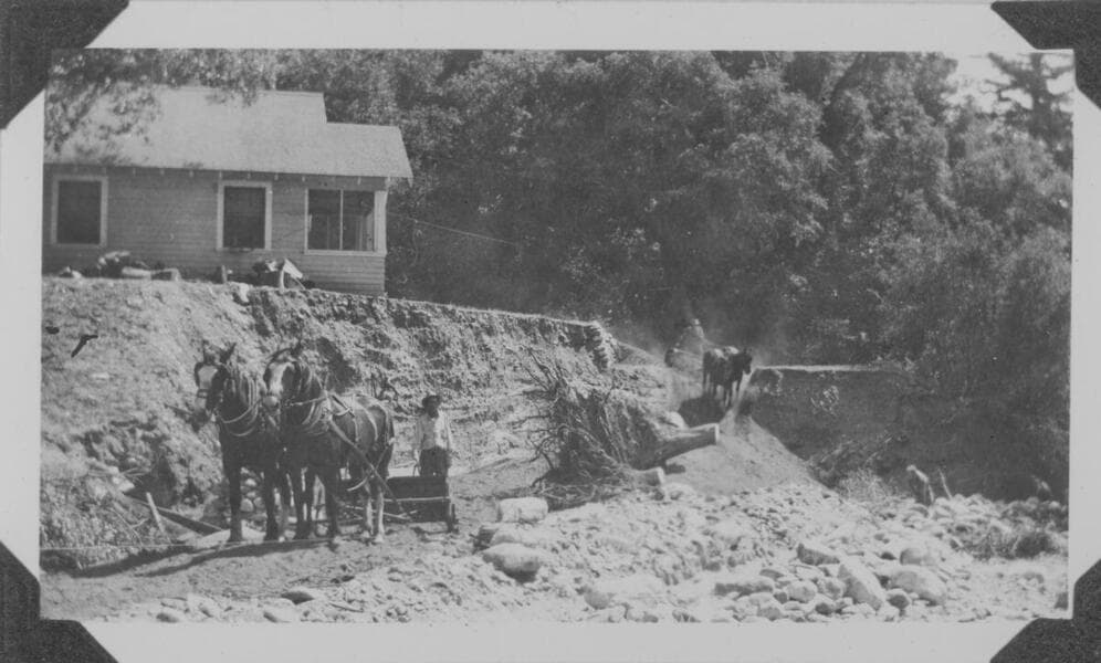 San Gorgonio Hydroelectric - Cottage of Powell F. Helton after storm of March 2, 1938. End of job. 90 sacks of cement in wall. 900 cu. yds. of dirt fill. Cost of job about $1,500.00