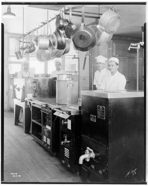 H1.2 - Heavy Duty Cooking - Metropolitan Water District - Camp Fargo - Kitchen in mess hall. [with kitchen staff].