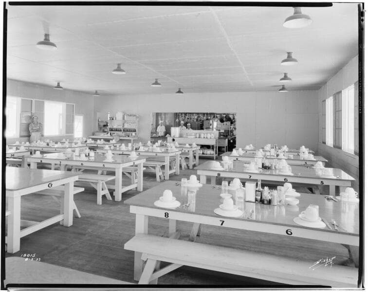 H1.2 - Heavy Duty Cooking - Metropolitan Water District - Camp Fargo - Kitchen in mess hall. [with kitchen staff].