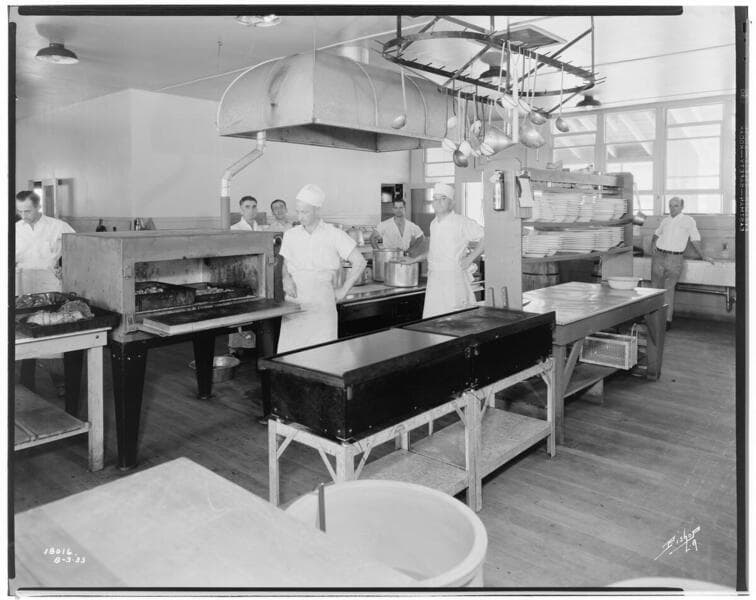 H1.2 - Heavy Duty Cooking - Metropolitan Water District - Camp Fargo - Kitchen in mess hall. [with kitchen staff].