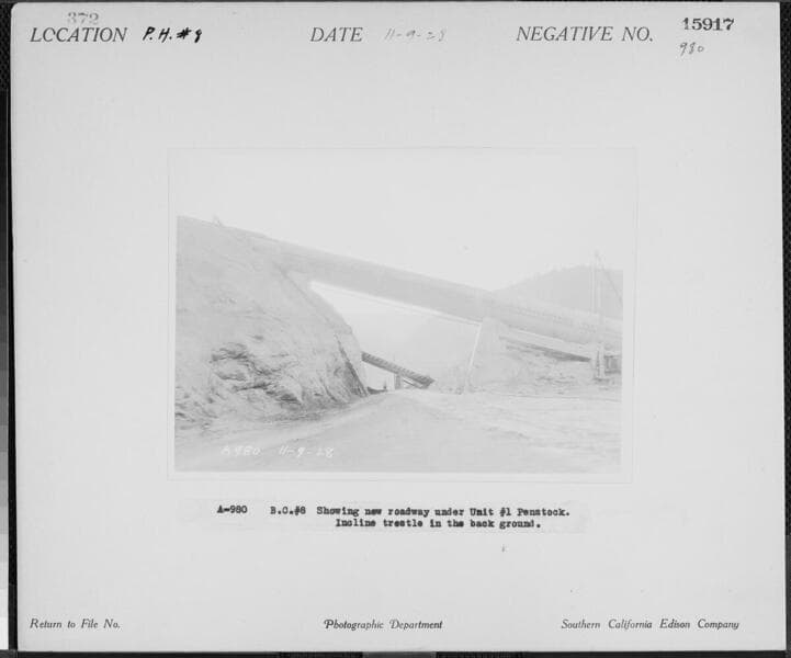 Big Creek Powerhouse #8 - Showing new roadway under Unit #1 Penstock. Incline trestle in the foreground.