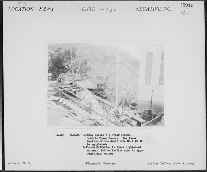 Big Creek Powerhouse #8 - Looking down Big Creek Channel towards Powerhouse #8. The derrick at the left serves the incline spur trestle.