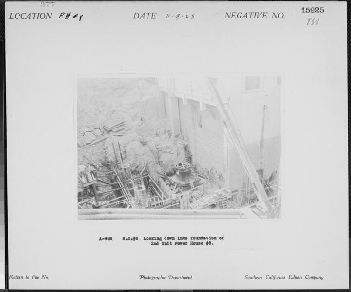 Big Creek Powerhouse #8 - Looking down into foundation of 2nd Unit Powerhouse #8. Jackhammer men completing excavation for Anchor #1.