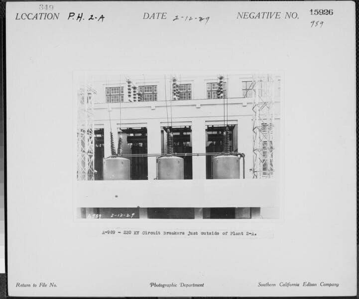 Big Creek Powerhouse 2A - 220kV circuit breakers outside Plant 2A, together with dead-end structure above.