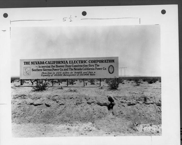 California Electric Power Corp. - Nevada-California Electric Corp. - Map of Nevada-California Electric Co. Transmission Line from Victorville to Boulder (Hoover) Dam site with profiles, tower drawings (standard type "H", type "AL", type "T" transposition, type "SW" switching, and details), photos of construction camps, tower installations, building tower bases, hanging insulators, stringing conductors, splicing conductor, switching towers, angle towers, angle "AP" type towers, dead end towers, and the Hoover Dam Substation.