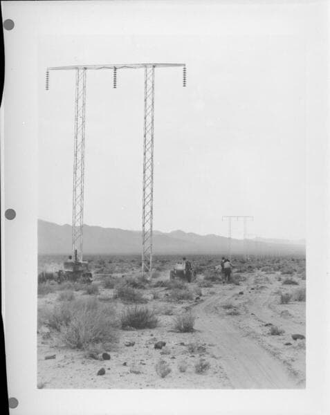 California Electric Power Corp. - Nevada-California Electric Corp. - Map of Nevada-California Electric Co. Transmission Line from Victorville to Boulder (Hoover) Dam site with profiles, tower drawings (standard type "H", type "AL", type "T" transposition, type "SW" switching, and details), photos of construction camps, tower installations, building tower bases, hanging insulators, stringing conductors, splicing conductor, switching towers, angle towers, angle "AP" type towers, dead end towers, and the Hoover Dam Substation.