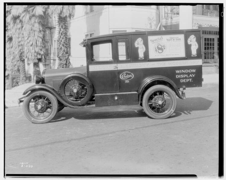 Window Display Department Truck #2611. [Full side with people inside truck cab. Advertisement on side of truck: Special this Month/for only $8.95/Electric waffle iron made by Westinghouse]
