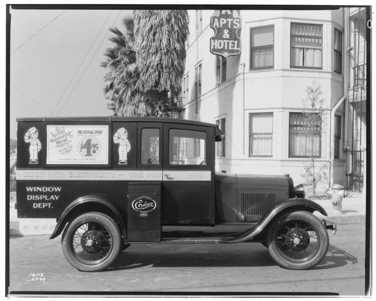 Window Display Department Truck #2611. [Full side with people inside truck cab. Advertisement on side of truck: Special this Month/for only $8.95/Electric waffle iron made by Westinghouse]