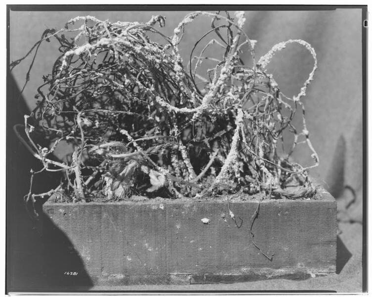 I1 - Insectary - Santa Paula - Potato sprouts fully infested with mealy bugs - close up. Cryptolaemus (Lady Bird) beatles are introduced which lay eggs in the mealy bugs.