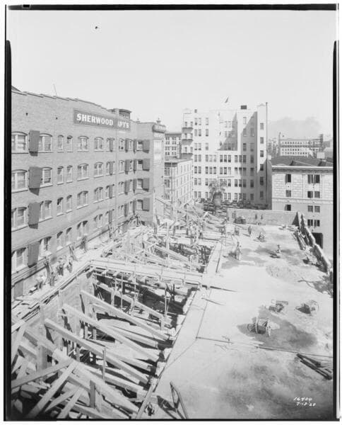 B1.20 - Edison Building, 5th & Grand - looking into excavation from east end [showing dismantling stage of Alexandria Garage].