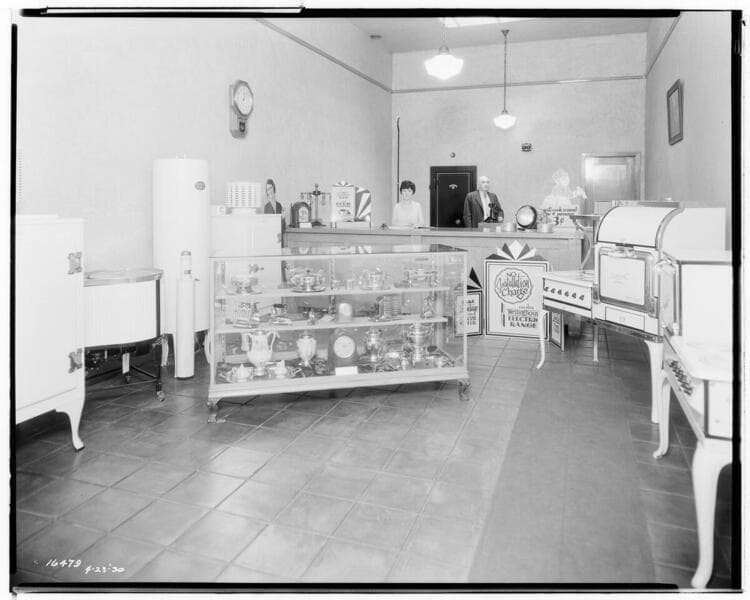 Local Offices A-Z - The interior of the Pasadena Local Office, [showing electric appliance displays]