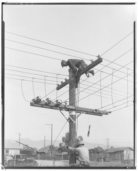 "Safety First" - live wire on step [staged safety photo, child pointing to lineman contacting live wire]
