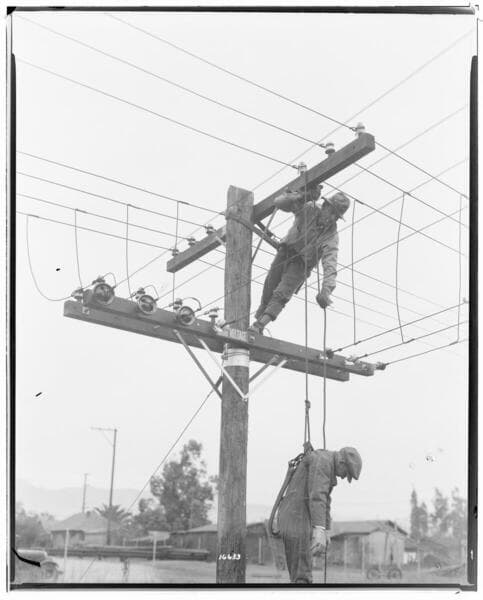 Distribution Lines - "Safety First" - Pouring solder on hot connection at pole on 3rd Street.