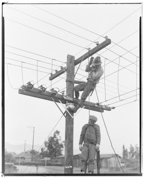 Distribution Lines - "Safety First" - Pouring solder on hot connection at pole on 3rd Street.