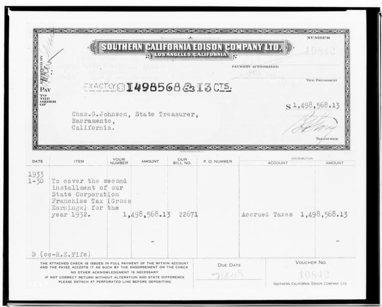 C1.4 - Checks - Copy of check for SCE taxes, first half, 1929 [$1,296,357.19]