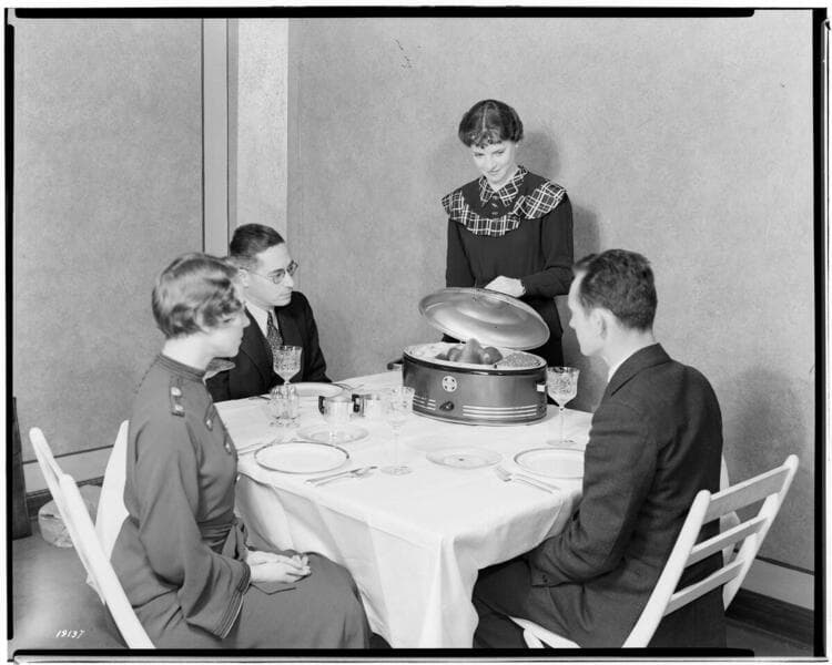 A3.1 - Appliances miscellaneous - Westinghouse Roaster School - l to r: Joe Schull, Mr. Rice, Mr. Hardy at table.