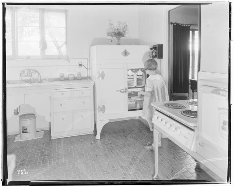 H2.3 - Home Kitchen - Dr. & Mrs. Harwood's Electric Kitchen - [Mrs. Harwood removing item from refrigerator.]