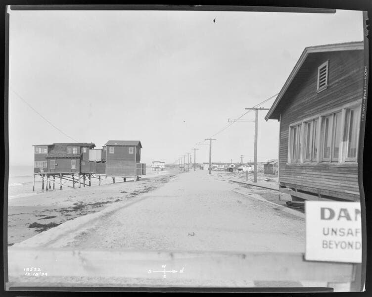 A1.5 - Tides - High-tide damage at 36th street Newport Beach - [a section of electric trolley tracks have been washed out and beach homes are stranded on tall stilts with beach sand washed away beneath them].
