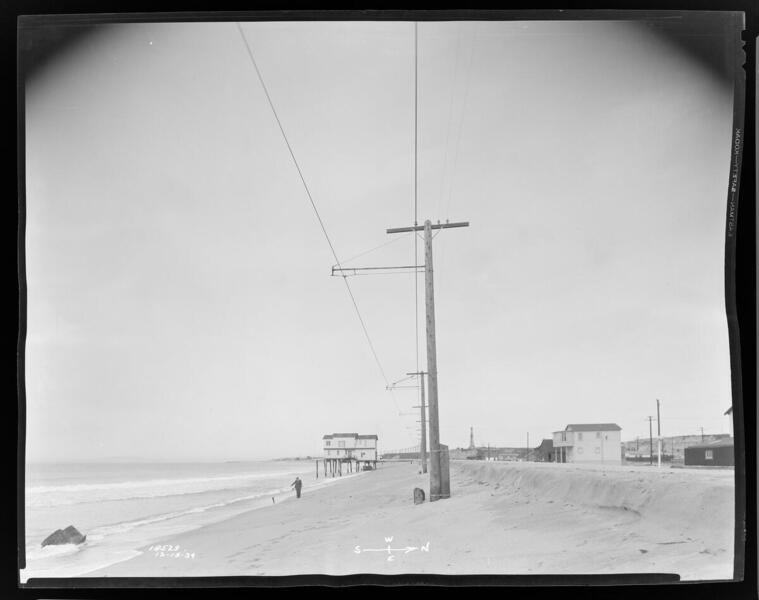 A1.5 - Tides - High-tide damage at 36th street Newport Beach - [a section of electric trolley tracks have been washed out and beach homes are stranded on tall stilts with beach sand washed away beneath them].