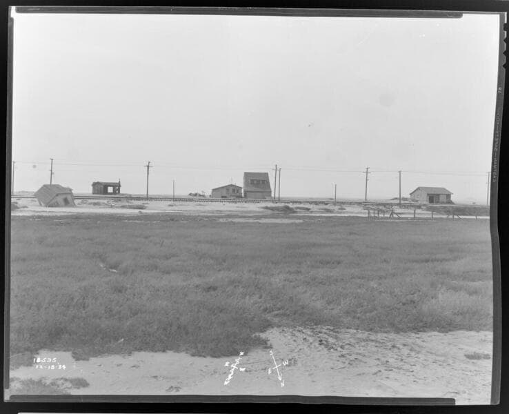 A1.5 - Tides - Newport Beach - High Tide Damage - showing cottage stranded in air on pole foundation and electric trolley line with no tracks.