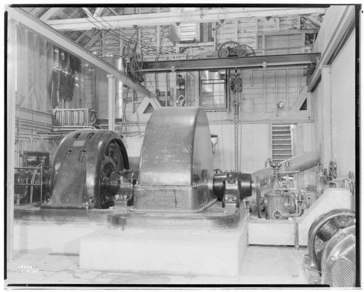 Mill Creek 1, 2&3 Powerhouse - interior of old Mill Creek #1 - First three-phase Alternating Current generator in back.