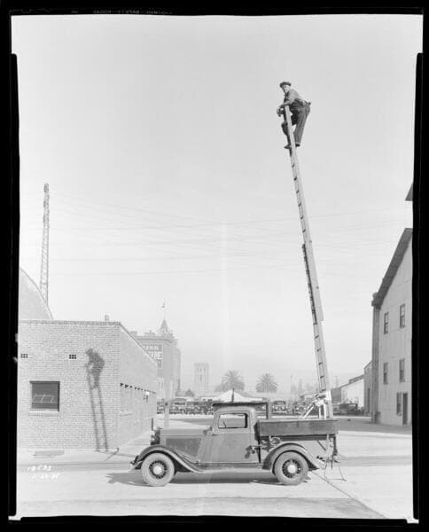 T3.1 Transportation - Autos, Trucks, & Railcars - Special Truck #2626 with ladder erect and man at top.