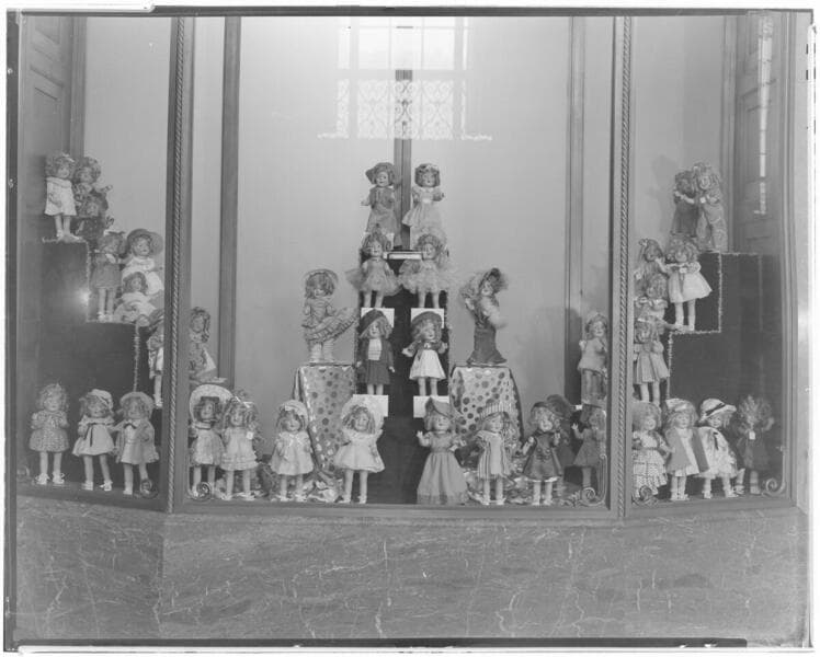 Window display of dolls produced in the 1932 Christmas Doll Contest. Dolls are given to needy children at Christmas.