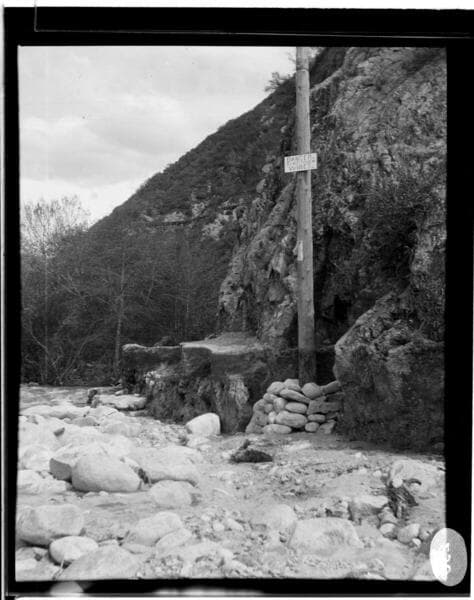 A man walking along the Santa Ana River transmission line in the canyon. The copy negative was shot backwards.