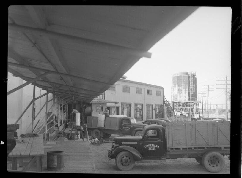 Imperial Ice Plant - loading trucks with block ice.