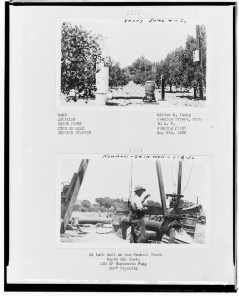 P4 - Pumping Plants - page 3 of Laws Book. [Two copy prints of Pumping Plant customers - George Ota, tomato farmer; & Fred Miller, domestic & agriculture use.]