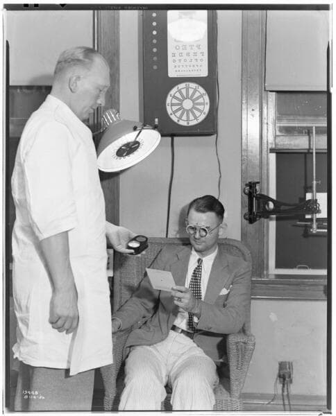 L1.5 - Lighting, Offices - Night Lighting - Optometrist's office at Downey - man getting an eye exam.