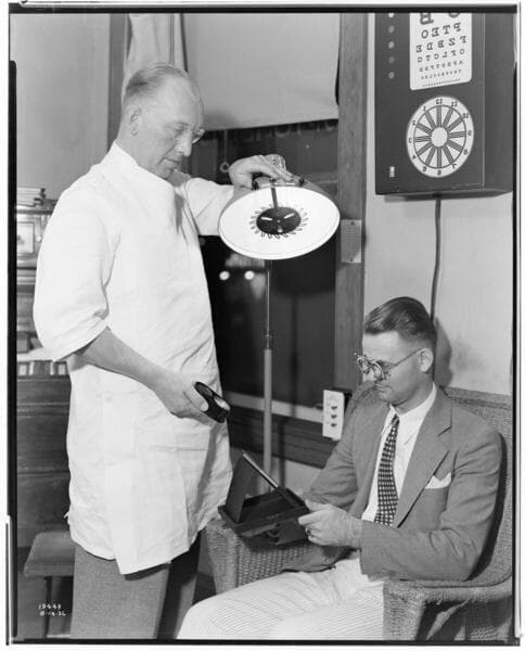 L1.5 - Lighting, Offices - Night Lighting - Optometrist's office at Downey - man getting an eye exam.