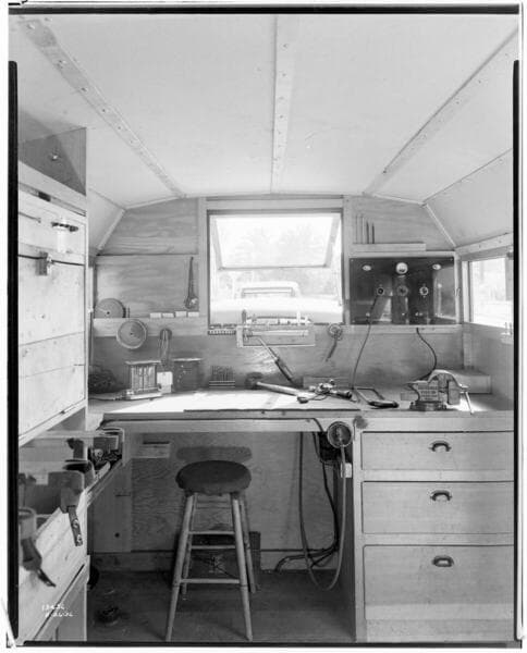 T3.1 Transportation - Autos, Trucks, & Railcars - Com[mercial] Dept. Service Trailer inside with man working at work bench.