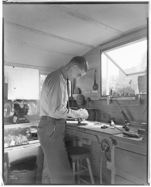 T3.1 Transportation - Autos, Trucks, & Railcars - Com[mercial] Dept. Service Trailer inside of repair trailer showing work bench.