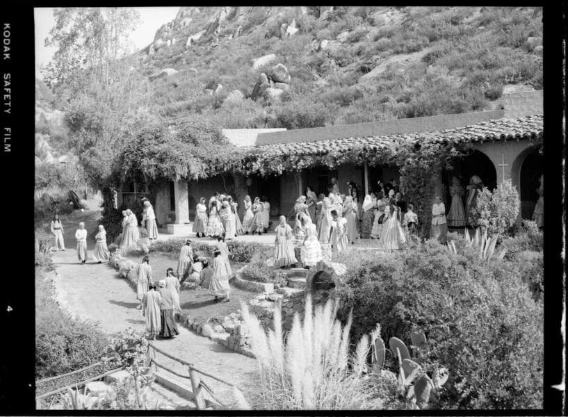 Hemet - Ramona Pageant 1957 - Celebration of native American people at a hacienda with television coverage.